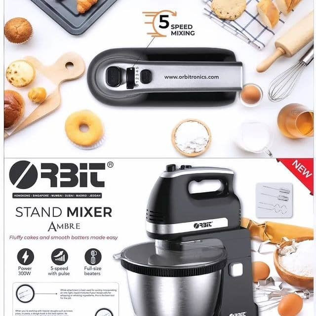 همزن کاسه دار اربیت O R B I T سایز بزرگ با ظرفیت 5 لیتر با کاسه استیل ضد زنگ با موتور قدرتمند ۳۰۰ وات واقعی و ۵ سرعت و دارای درب کاسه و تیغه همزن و خمیر زن با کیفیت عالی و طراحی زیبا