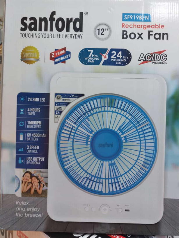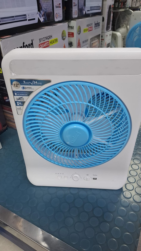 پنکه شارژی سانفورد برقی و شارژی با قابلیت کارکرد ۷ ساعت بدون برق با قابلیت استفاده از برق مستقیم و پاور بانک و شارژ داخلی و دارای چراغ روشنایی اضطراری و پاور بانک با کیفیت عالی و طراحی زیبا