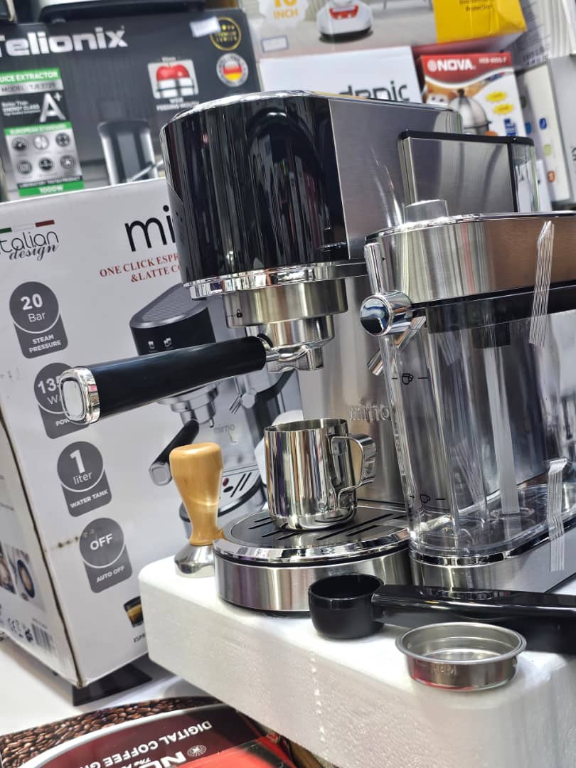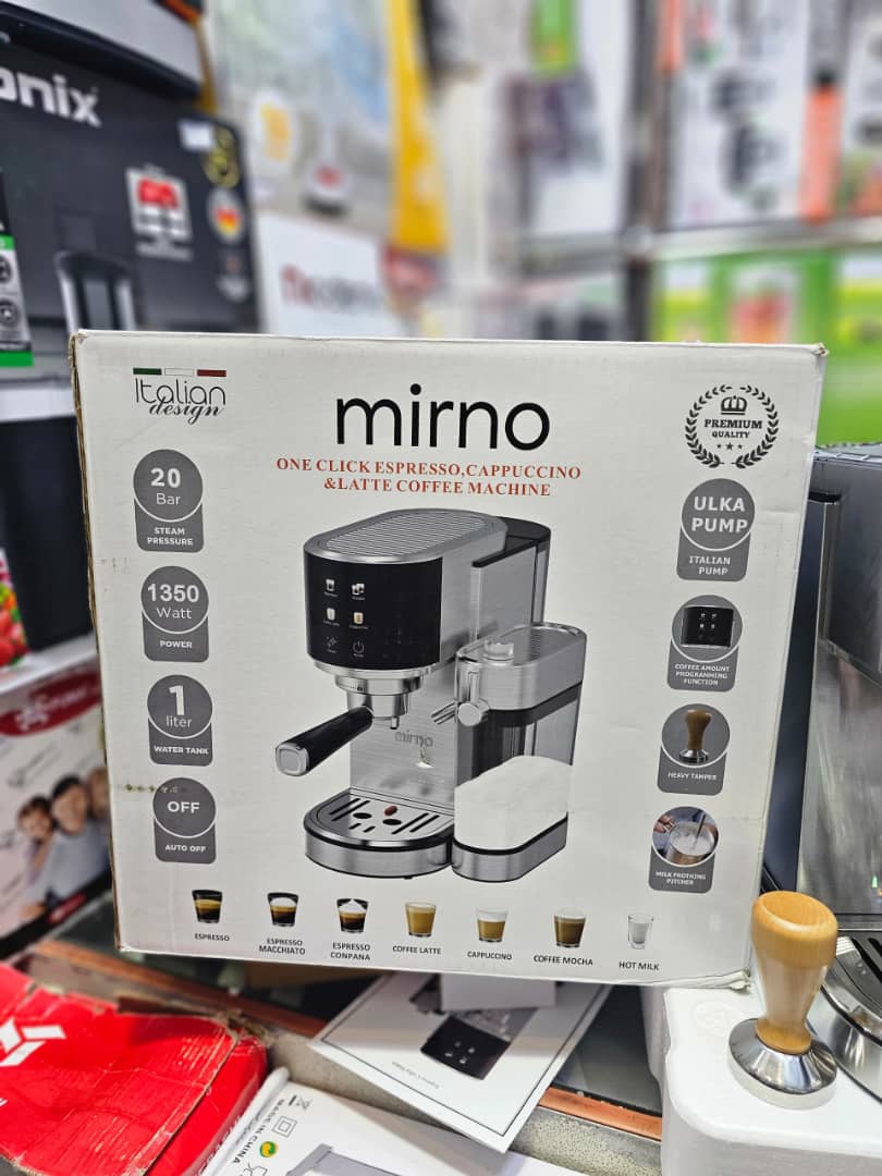 اسپرسوساز اتوماتیک میرنو(mirno) دارای مخزن شیر با قدرت ۱۳۵۰ وات دارای پمپ ایتالیایی اولکا با قدرت ۲۰ بار با صفحه نمایش و کنترل دیجیتال تمام تاچ دارای برنامه های خودکار اسپرسو تک و دوبل و کاپوچینو و کافه لاته و دارای برنامه شستشو اتوماتیک با بدنه تمام استیل دارای اکسسوری کامل از جمله پیچر و تمپر و بسکت تک و دوبل با کیفیت عالی و طراحی زیبا و مدرن با قابلیت خاموشی خودکار